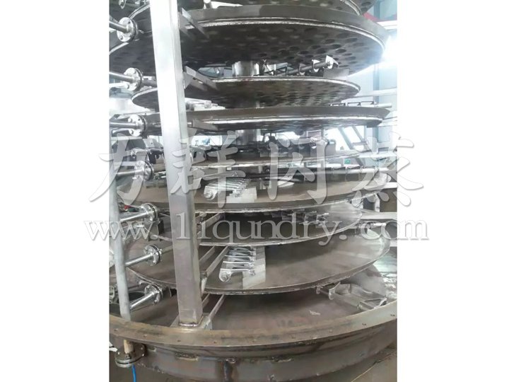 濕物料自加料器連續地加到干燥器上部第一層干燥盤上,帶有耙葉的耙臂作回轉運動使耙臂作回轉運動使耙葉連續地翻抄物料。物料沿指數螺旋線流過干燥盤表面,在小干燥盤上的物料被移送到外緣,并在外緣落到下方的大干燥盤外緣,在大干盤上物料向里移動并從中間落料口落如下一層小干燥盤中。大小干燥盤上下交替排列,物料得以連續地流過整個干燥器。中空的干燥盤內通入加熱介質,加熱介質形式有飽和蒸汽、熱水和導熱油,加熱介質由干燥盤的一端進入,從另一端導出。已干物料從^后一層干燥盤落到殼體的底層,^后被耙葉移送到出料口排出。濕份從物料中逸出,由設在頂蓋上的排濕口排出,真空型盤式干燥器的濕氣由設在頂蓋上的真空泵口排出。從底層排出的干物料可直接包裝。通過配加翅片加熱器、溶劑回收冷凝器、袋式除塵器、干料返混機構、引風機等輔機,可提高其干燥的生產能力,干燥膏糊狀和熱敏性物 料,可方便地回收溶劑,并能進行熱解和反應操作。